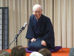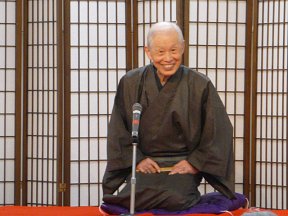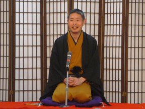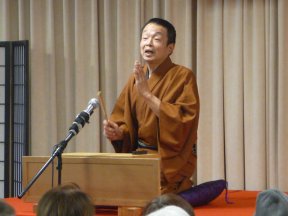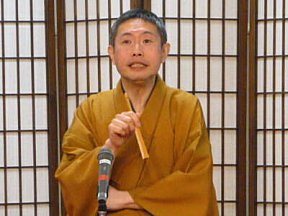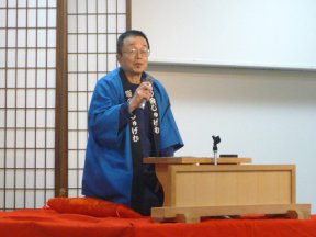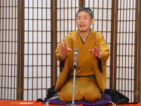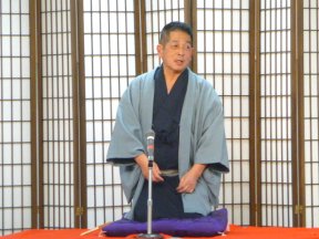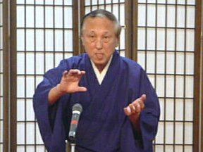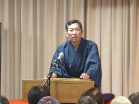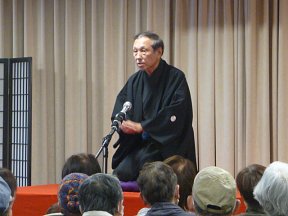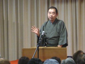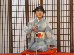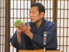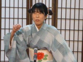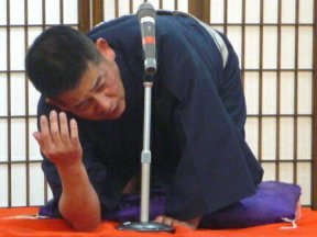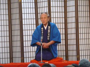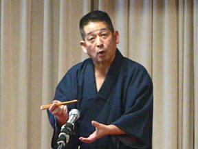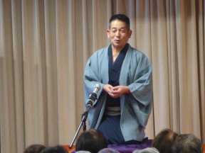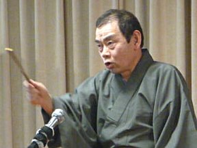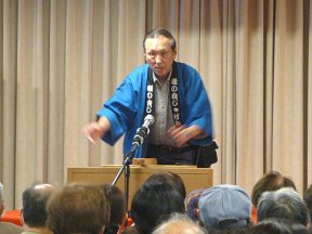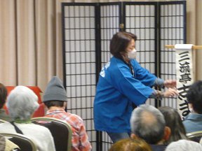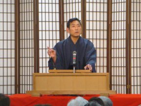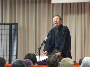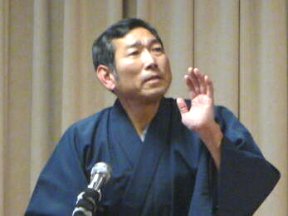 三席目は、三流亭志まね(さんりゅうてい ・しまね)さんです。演目は、江戸落語の 「時そば」です。上方落語では「時うどん」 で演じられる古典中の古典といえますが、 そこは現代風にアレンジして、そば屋を だまして小銭をごまかそうとします。 |